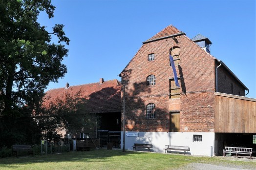 Etwa zeitgleich mit der zu Beginn des 17. Jahrhunderts errichteten Vernaburg wurde am Hederufer eine Mühle angelegt. Vorgängerbauten in dem Bereich sind bislang nicht bekannt. Unterschiede im Ziegelmauerwerk verweisen darauf, dass das heutige Mühlengebäude ursprünglich zweigeschossig war und ein Satteldach hatte. Die Erweiterung um das dritte Stockwerk veranlasste Bernhard Schäfermeier, der 1928 einen entsprechenden Antrag stellte. Aus jüngster Zeit stammt hingegen der 2015/2016 ergänzte Aussichtsturm. Vom Dachboden der Mühle zugänglich, bietet die gläserne Kanzel weite Blicke ins Naturschutzgebiet Hederaue.