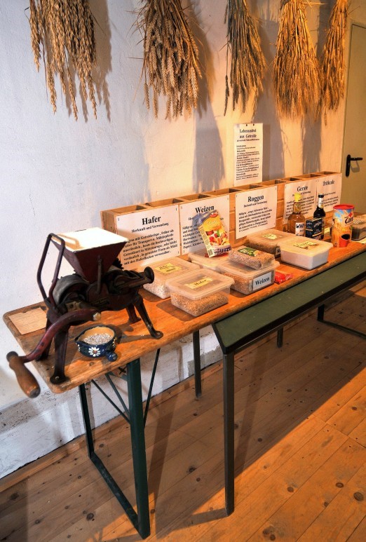 Hafer, Weizen, Roggen, Gerste, Triticale: Getreidebündel veranschaulichen die wesentlichen Unterscheidungsmerkmale der jeweiligen Art. Die kleine Ausstellung richtet sich vor allem an Kinder, die beim Betätigen der Haferflockenmühle auch erfahren, wie ihr Müsli entsteht.