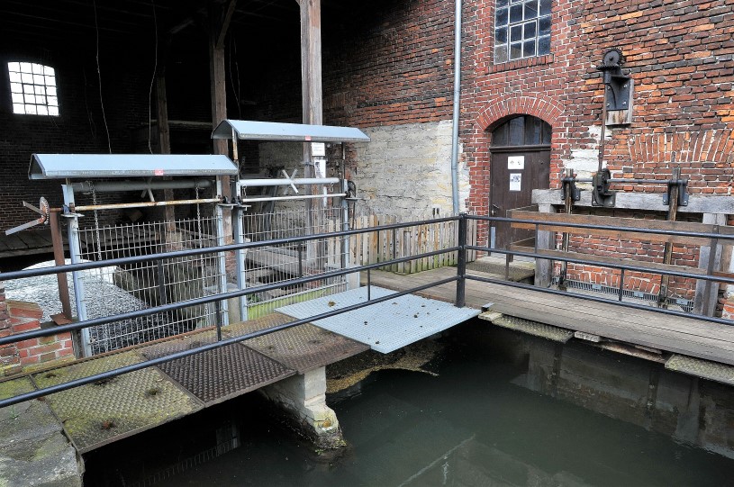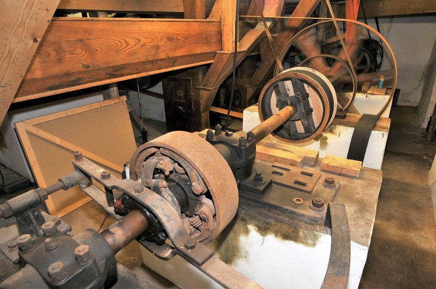 Die technische Anlage (Bild Hauptantriebswelle mit Kupplung) zum Antrieb der Mühle ist ein komplexes Gebilde aus teilweise ineinander greifenden Räderwerken und mehreren, zur Kraftübertragung genutzten Transmissionsriemen. Sobald sich das Ganze bewegt, reicht ein kontinuierlicher Wasserzulauf für den weiteren Betrieb.
